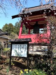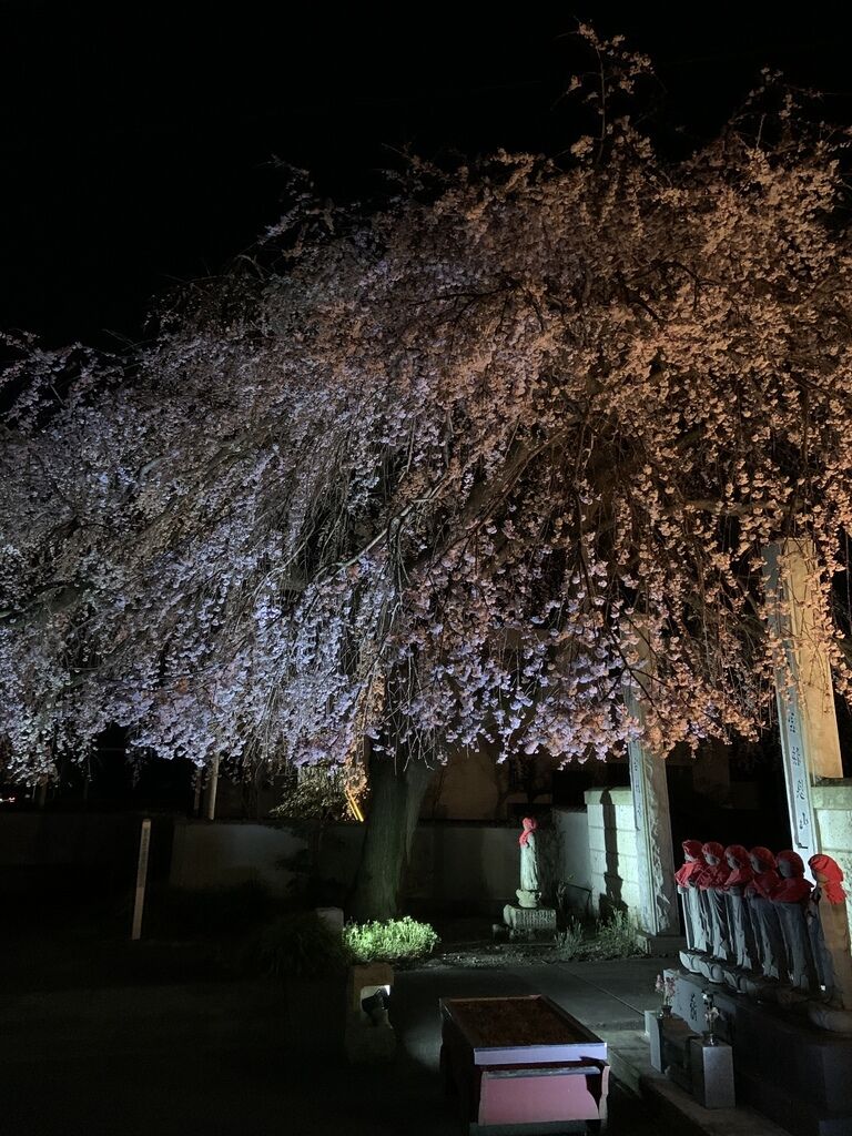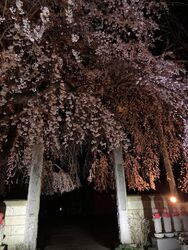 県道沿いに見事な枝垂れ桜が咲いています。境内の鐘楼わきにも桜の巨木があります。枝垂れ桜は、夜間、ライトアップされていました。日中に見る桜とは異なり、幻想的な光景に感動しました。 (訪問:2020/03/24)