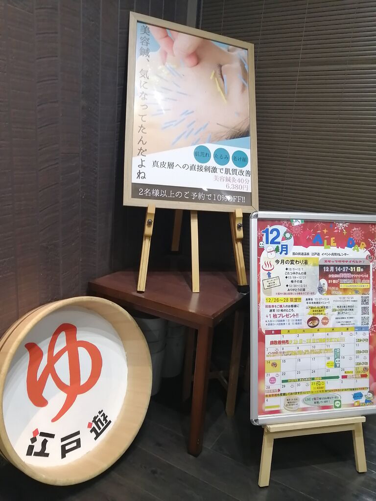 NEW「今日は江戸遊へ行こっ♪」…本日の〆はこちらの温泉です。私は初訪問。入って直ぐ「2名様以上のご予約で10%off…美容鍼」の案内に目が留まり…「やってみたいね♪」「うん!やろうよ♪」と意気投合。温泉に入る前に2階に行って予約をしました。予約の時間まで温泉であったまり→いざ人生初の[美容鍼]へ!( ˶>ᴗ<˶)ワクワク…頭…顔…鎖骨下…足に鍼を刺します。それほど痛みはありません。鏡で見せてくれたらハリネズミみたいに顔中鍼だらけで笑えたꉂꉂ(ᵔᗜᵔ*)お香を焚いてしばらくそのままリラックス。1ヶ月毎にやると良い…とのこと。またやりた~い♪それから温泉に戻り露天風呂へ。大好きな[高濃度炭酸湯]に2時間浸かって→風呂上がりにいつものコーヒー牛乳を飲んで…すでに時間は22時。今日も楽しかったなぁ(˶ᐢᴗᐢ˶) (訪問:2025/12/03)