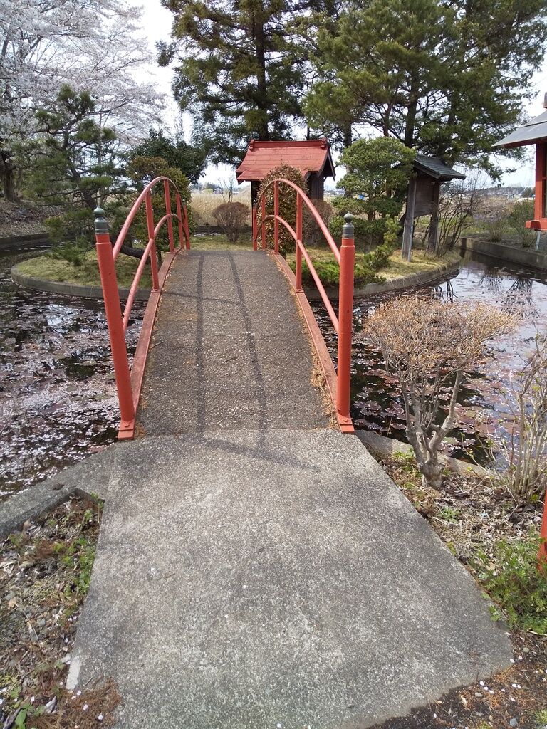 小山市の“城北2丁目“交差点から東へ約800m進むと案内表示板があります。そこを左折し、一方通行の道を北へ約500m進むと左側に鳥居が見えてきます。神社入口から奥へ歩いていくと池があり、中に小さな島があります。ここには赤い屋根の祠があり、“太鼓橋“を渡って行くことができます。池にはスイレン、池の南側には桜の木があり、それぞれの花の季節に訪れてみるとよいかもしれません。 (訪問:2020/09/30)