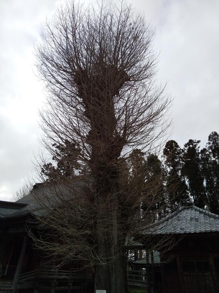 芳賀町天然記念物のイチョウ、ムクロジュを見に行きました。地蔵堂の隣にあるイチョウは樹高20mで傾斜して立っている一本だちの木です。根本から幹にかけてエグレていますが意を介さず飄々とした装いの木で筆のように見えました。ムクロジュは樹高25mで鐘楼に寄り添うように立っています。柵で囲まれ保護されていて夏にはアオバズクが巣を作るそうです。こちらも傾斜して立っていて途中から幹が2本に分かれて枝を自由に伸ばしていました。どちらの木も樹齢の記載はありませんでしたが姿形を見る限り古木であることは相違ない事実であることが分かりました。 (訪問:2020/01/11)