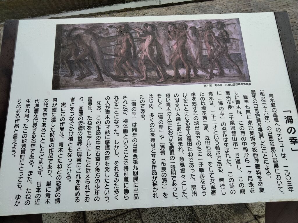 ふれあいの芳賀路スタンプラリーで訪れました。天才画家で僅か28歳で亡くなった青木繁と恋人で長男を産んだ洋画家の福田たねを記念した公園です。福田たねは芳賀町出身の人でコノ近くにあった実家に青木と短い期間ですが暮らしていたそうです。碑の近くにサクラが植栽されていて見頃となっておりました。また五行川には青木の最高傑作で重要文化財である「海の幸」のレプリカを見る事が出来ました。人々が意気揚々と戦場に向う姿が描かれソノ後の躍進の様子が目に浮かぶエネルギーに満ち溢れた作品であります。青木繁と福田たね二人の思い出が詰まった場所であることはモチロンですが見に来た人々の心に残る場所であると感じました。 (訪問:2023/03/25)