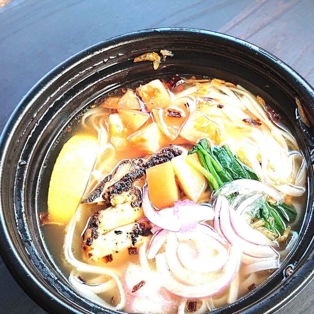 以前より行ってみたかった西参道茶屋の【Manten chicken grill nikko】へ初訪問です(*^^*)。。。看板メニューの『マンテンチキングリル』と凄く気になっていた『炭焼きチキン&フォー』のテイクアウトをオーダーしました(^o^)/。。。マンテンチキングリルは、日光の醤油と麹を使って柔らかくした鶏もも肉を炭火で焼いています。とても柔らかく醤油の味と香りに炭焼の燻薫が加わり食欲をそそります(*^^*)v。。。炭焼きチキン&フォーは、玉ねぎとほうれん草に炭火焼のチキンスライス(骨の無いマンテンチキングリル?)を加えてレモンを添えて作った米粉麺(フォー)です。スープは、じっくりと鶏を煮込んで取った旨味の凝縮した透き通ったもので、炭火焼きの鶏の旨味と合わさって堪らない美味しさです。特に今日みたいに寒い日にはお勧めの逸品ですねぇ(*^^*)v。。。他には、日光人がこよなく愛する山椒の佃煮を入れて炭火で焼き上げた『マンテン焼きオニギリ』『搾りたて果実レモネード』等の美味しそうなものが有ったので、次回はこちらも味わってみたいですね(*^^*)...【Manten chicken grill nikko】炭火焼の香りが好きな方や旨いチキンが好きな方には、特にお勧めですよ~( ^-^)ノ∠※。.:*:・'°☆ (訪問:2022/02/07)