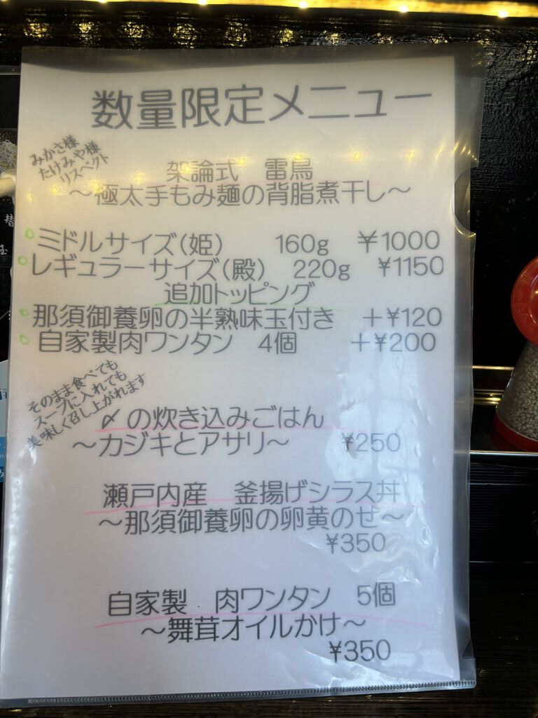 お昼に麺双架論へ。週末限定麺 架論式 雷鳥(殿)TP 半熟味玉。自家製極太麺が美味しく具材も豊富で味玉も美味しかったです。寒い日に熱々のスープが美味しく、身体も温まりました。 (訪問:2025/03/16)