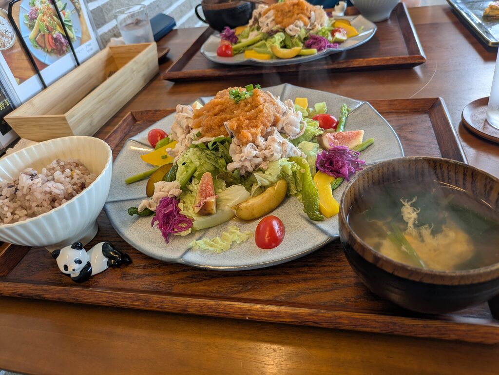 ランチタイムに初めてお邪魔しました。予約をしたのでスムーズに入店できましたが、店内は人が多かったです。メニューは豚しゃぶサラダを注文。色々な野菜たっぷりでヘルシーながらボリュームがありました。ニンジンのドレッシングがとても美味しくて、ニンジンが苦手な私でもペロリと食べることが出来ました。友人が頼んでいたハンバーグも美味しそうだったので、またぜひ行きたいと思います。 (訪問:2025/03/06)