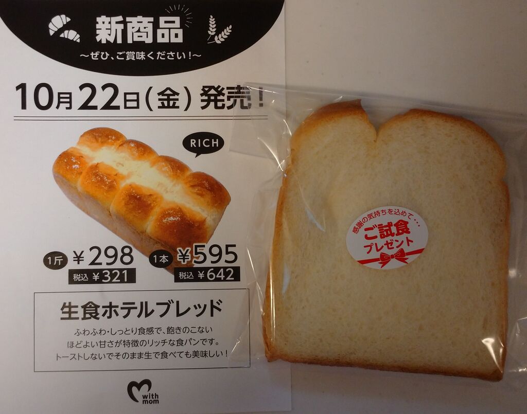 ベニマルで買い物途中、新商品の試食をいただきました☆“生食ホテルブレッド”が10月22日に発売だそうです。ふわふわなのでトーストするのがもったいないくらいで、そのまま食べて噛めば噛む程甘さがあります♪是非、1斤や1本食べてみたいです(^ー^) (訪問:2021/10/17)