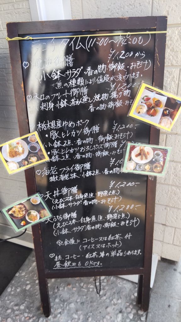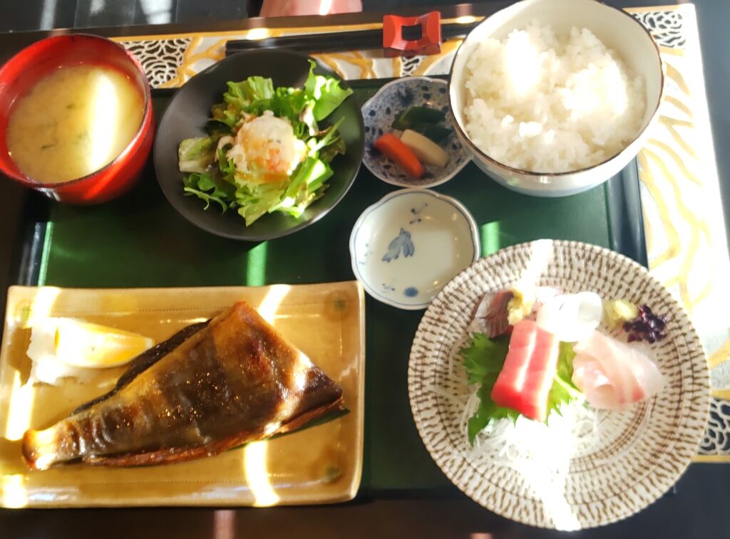 車が4台停められる駐車スペースの奥に入り口があります。平日ですがほぼ満席、賑わってました。お刺身定食は売り切れとのことで、和のプレート御膳をいただきました。フライはお肉では無くまぐろ、蓋がしてあるのは茶碗蒸し、真ん中のはローストビーフです、少しずつ色んなものが味わえて、刺身も焼き魚も全部クオリティが高くて、美味しかったです。食後にコーヒーがつきました。 (訪問:2024/07/19)