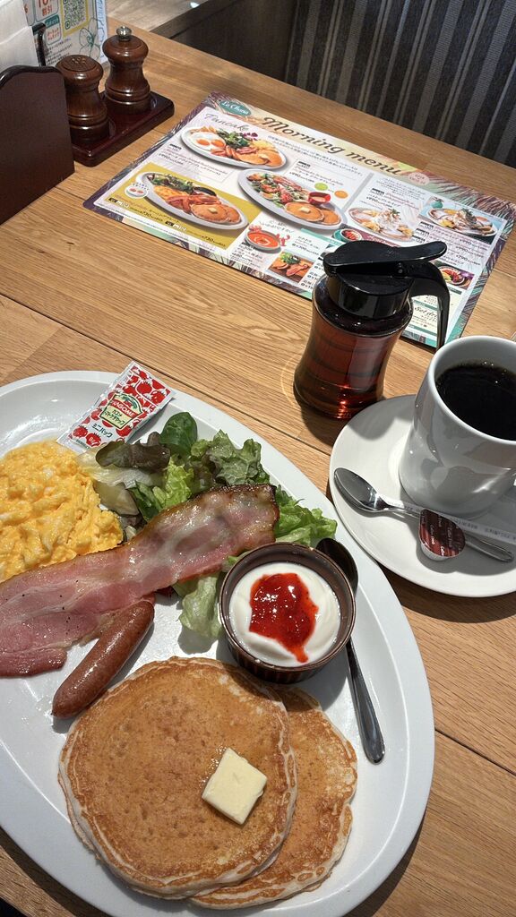土日やってるモーニングメニューのセットドリンク無料クーポンがLINEにきていたので土曜の朝9時に来店。モーニングプレート803円にホットコーヒーを注文。タッチパネルでの注文でクーポン番号を入力すればOK。スクランブルエッグか目玉焼きが選べてサラダベーコンウインナーヨーグルト、もちもちパンケーキは食後にシロップをたっぷりかけてお腹いっぱいになるプレートでした。 (訪問:2026/04/18)