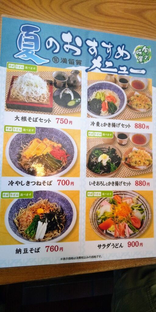 まるかランチ700円税込みを注文しました。冷たい温かい、ウドンソバかを選択でき冷たいソバにしました。栃木パスポートの提示でアイスクリーム、ソフトドリンク、ソバ大盛り(ウドンを選択した場合ウドン大盛り)の何れかが無料で付きます。アイスコーヒーを選択して食後に頂くことにしました。注文してから5分も待たずに料理は到着しました。ライス、冷奴、漬物が付きました。ソバの具材は山菜、ワカメ、ナルト、天かす、ホウレン草、カマボコです。ソバは香が良くコシがあります。つけ汁は甘めですがカツオの出汁が程よく効いておりました。ランチはライスも大盛り無料ですがしなくて良かったと思う程ボリュームがあり満腹です。ソバウドンだけでなく定食やお子様セット(お菓子付き)もありランチも午後3時まで注文可能で使い勝手が良いお店です。 (訪問:2022/08/05)