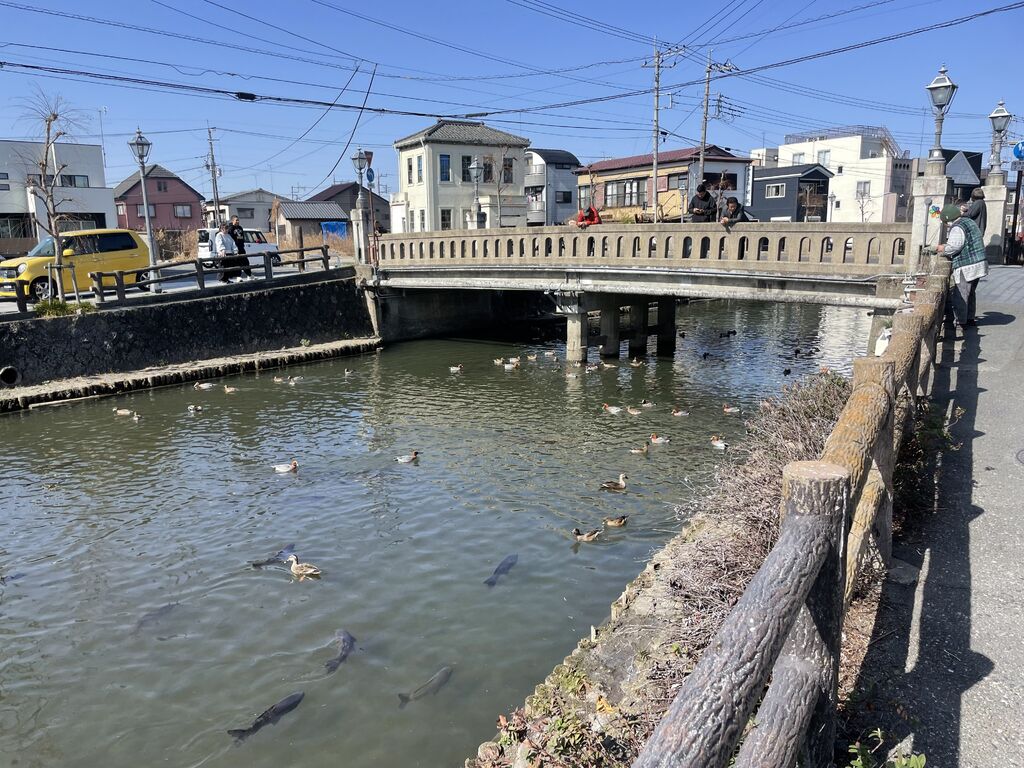 栃木市の街中を流れる川です。大きな鯉がゆうゆうと泳いでいました。昔はこの川を使って荷物を江戸などに運んでいたそうです。 (訪問:2025/10/13)