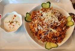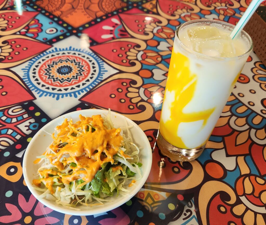 2023年4月14日オープンしたインドカレー屋さんに初訪問です。大好きなビリヤニが3種類ありました。注文は「マトンビリヤニ 1,200円」辛さは中辛に。サラダ、ドリンク、ヨーグルト付き。ドリンクは「マンゴーラッシー」。ヨーグルトもあるので中辛で調度良かった。熱々でピリ辛で美味しいです。 (訪問:2023/04/21)