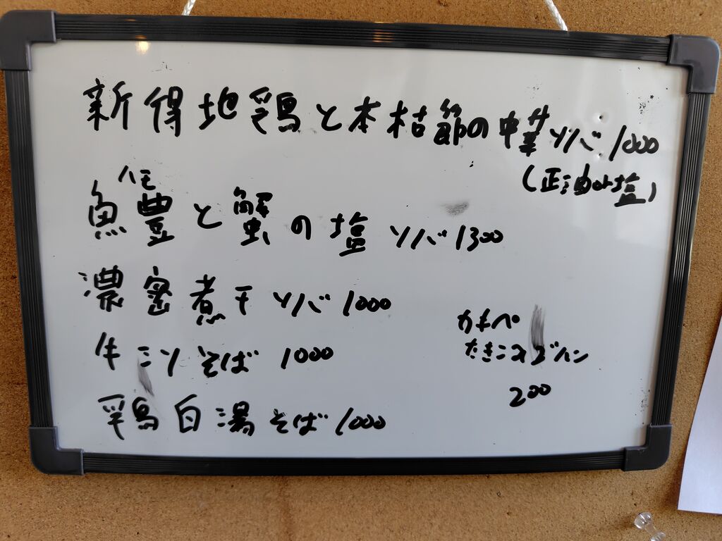 温泉へ行く前に、伺いました。満席のため、呼び出しベルをもらいましたが…券売機でいろいろ迷っていたので、待った気はしませんでした。私は煮干そば。相方は、鶏そばです。お店自慢の鶏そばは、今まで食べた鶏そばで一番美味しかった。と言っていました。煮干しそばは、煮干しラーメンが好きな方にお勧めです。 (訪問:2024/01/21)