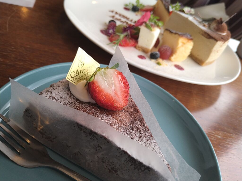 昼食の蕎麦屋さんで食べようと思っていたあんみつがお休みだったのでデザートが食べたくてケーキ屋さんにおじゃましました。注文は私が「シャインマスカット ショートケーキ 480円」「ラブフル 500円」。妻が「ショコラ 500円」「セルフコーヒー 200円」甘過ぎない生クリームににっこり感の凄いジュースが気に入りました。 (訪問:2024/09/16)