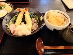 ミニかき揚げ丼セットをいただきました。お値段950円。お値段的に、お蕎麦もミニサイズだろうと思っていたのですが、きっちり一人前ありました。しかも、このお蕎麦、超つやつや。そして激旨。これからどんどん湿度と気温が上がってきますが、このお蕎麦なら、不快指数がどんなに上がっても食べられそうなおいしさです。冷ややっこもおいしいです。サラダも、コールスローが極細でふんわり、やわらか。お蕎麦やさんのサラダとは思えないおいしさです。でも、なんと言っても一番素晴らしいのが、ミニかき揚げ丼。かき揚げがすこぶる分厚いです。それに、大きさがミニサイズのどんぶりにジャストフィット。からっとしているし、口当たりはさくっと軽いし、おいしさに、まじ感動です。これで、1000円でおつり来るなんて、ますます感動です。突き出しにいただいた、大根の煮物も、味付けがしっかりしていて、とてもおいしかったです。ランチをいただいて、午後2時からはカフェになるみたいです。おいしそうなドリンクメニューがずらずらっと並んでいます。今日、時間に余裕があったら、このまま2時までずっとお店にいたかもしれません。ちょっと気になっていたので、お邪魔したお店だったのですが、より一層気になるお店になりました。 (訪問:2023/06/09)
