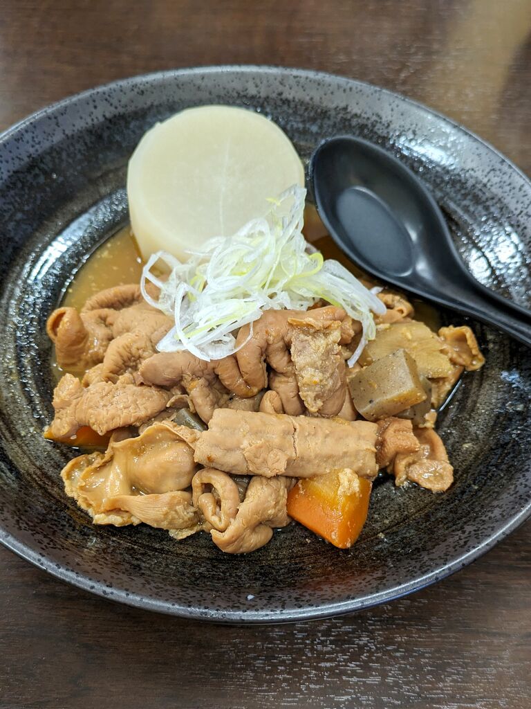 もつ煮が食べてみたくてお昼に伺いました。ラーメン屋さんなのですが、券売機で選んだメニューは【もつ煮定食】でした。よく煮込まれたもつは、柔らかくて味が染みていて旨い!脇を添えるポテサラも嬉しい一品です。どうしてもご飯が足りない・・・。おかわりお願いしちゃいました。最後はご飯をもつ煮の器に入れて食べてみると、ご飯が汁を吸って絶品じゃないですかぁ~。美味しかったです。ごちそうさまでした。 (訪問:2025/02/25)