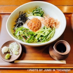 みなさんの口コミで拝見する度気になっていたこちら。今回ご縁あってお邪魔できました。11時半前に到着し、すんなり着席でしたが、この後から少し待ちが発生してました。ずーっとサラダそばをと思っていたのですが、たくさんあるメニューを拝見しているうちに、梅もおろしも納豆も大好きな私にはたまらない『梅おろし納豆そば1410円』を発見してしまい進路変更!ぶっかけ系のお蕎麦かなぁと待っていると、まさかのつけだれ系。それはそれはたっぷりすぎる程のおろしにひきわりの納豆、別添えで梅肉と青じそ。それらを少しずつ混ぜ、ツユを少し足らしてお蕎麦を。初めに何もつけずにお蕎麦のみ。コシが強くお蕎麦の香りもとってもよく、お蕎麦だけで食べ進めてしまうほど美味しい!!用意しておいたつけだれにお蕎麦をつけると、おろしの爽やかさに、納豆のコク、梅の甘酸っぱさと爽やかさが絶妙で美味しすぎ☆途中わさびもプラスしたりし、無心でペロリしてしまいました。蕎麦湯でまったり、美味しい濃密な時間でした。他のお蕎麦も絶対美味しいはず!次の訪問が楽しみです^^ (訪問:2025/02/01)