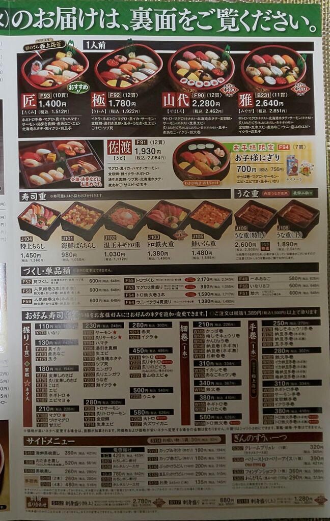 今日は敬老の日なので寿司でも注文しようということになりました。前に頼んで美味しかったのでこちらで購入することに。父母が「特上ちらし 2,095円×2」。妹が「鮭いくら丼 2,095円」。妻が「イクラ 367円」「エビマヨ 248円」「梅しそきゅうり 291円」「玉子 194円」「煮アナゴ 194円」「茶碗蒸し 313円」。私が「雅 3,553円」。ネタが新鮮で大きかった。テイクアウトにしては美味しいお寿司です。 (訪問:2024/09/16)