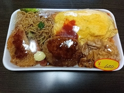 ボリューム満点なお弁当をチョイスしました。ずっしりした重みを感じます。中身もバラエティ豊かでオムライス・焼きそば・ハンバーグ・メンチカツ・唐揚げ・焼肉・ソーセージとお肉メニューがてんこ盛りです。 (訪問:2024/10/18)