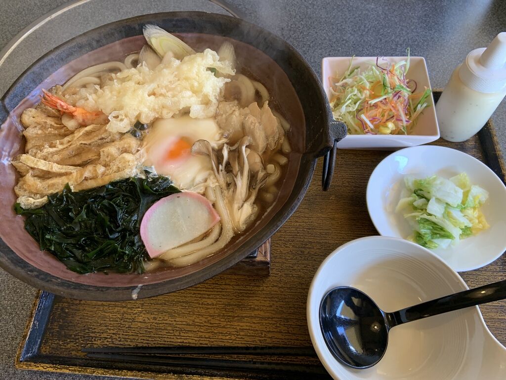 土曜日のランチタイムに夫婦で訪問。「鍋焼きうどん(880円)」と「おうげん御膳(ミックスフライ、1380円)」を注文しました。鍋焼きうどんには海老天・卵・油揚げ・わかめ・ネギなどの具がたっぷり入っています。固形燃料付きなので、最後まで熱々でいただくことができました。おうげん御膳のミックスフライは、ヒレカツ・海老フライ・カニクリームコロッケでした。ゴマをすり、自家製ソースでいただきましたが、衣のサクサク感が抜群です。客席はテーブル席のほかにカウンターと座敷があります。私たちの入店直後には、ほぼ満席となりました。混雑が予想される時間帯をずらして訪問するのが良いかもしれません。 (訪問:2020/02/01)