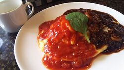 ダブルソース(トマトとハヤシ)のオムライスをいただきました!卵がとろとろ~♪どちらのソースも本当に美味しかったです。サイズはMとLがあり、料金は変わらないので、お腹をすかせて是非 Lサイズをいっちゃってください!最後まで飽きずに食べられると思います(*^^*) (訪問:2019/08/26)