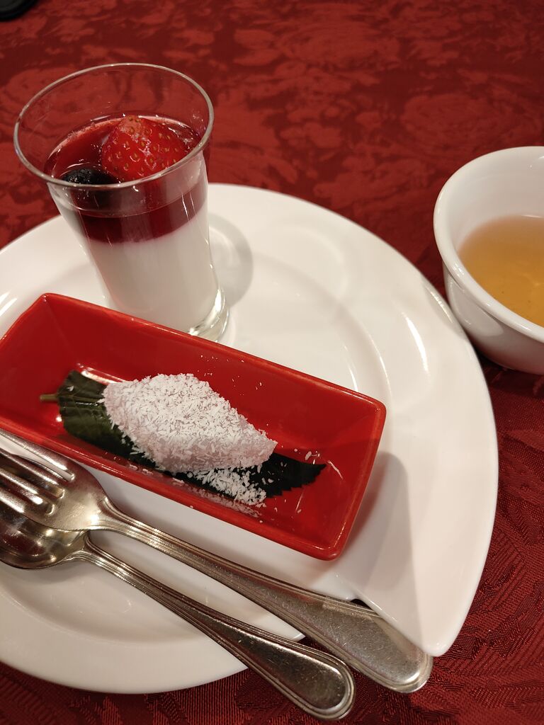 息子が彼女を家に連れてくるというので昼食にこちらを予約しました。注文は「季節の味覚ランチコース 3,500円×4」「八宝茶 1,000円×4」・季節の前菜取り合わせ・ズワイ蟹 干し貝柱のスープ 淡雪仕立て・北海道産赤烏賊と白身魚の蒸し物 フィッシュソース 柚子風味、・海老のチリソース アーモンドを 塗した海老すり身の揚げ物、・彩り野菜と牛肉の細切り炒め オイスターソース風味、・五目入り炒飯・アジアンスイーツ。色々味わえましたが特にイカと白身魚の蒸し物が柚子ソースと合って美味しかった。アーモンドでまとった海老すり身も食感が気に入りました。 (訪問:2025/01/19)