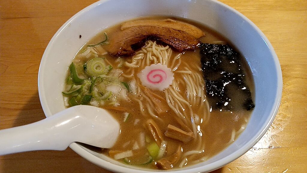 ウェイティングボードにはすでに数組の名が。それでも1ターン目には入れました。スタッフが前もって注文を聞きに回ってきました。バカうまラーメン(中)を注文。席に座ると水と大根の酢漬けが置かれました。さっぱりとした瑞々しいリセット食。そこにラーメンが届きました。家系ラーメンのような豚骨の香り。スープを口に含むと、濃厚の中に魚介系のだしの香りが鼻から抜けました。すするのにちょうどよい長さの、のど越しが気持ちの良い中細麺。スープが絡んでどんどん胃に収まっていきました。麺に撫でられる口の中が気持ちいい。海苔とも合う。メンマとも合う。ナルトとも合う。ねぎとも合う。チャーシューはトロトロで見事な逸品でした。合間合間にスープ飲みを挟みました。飲むたび唇がてかってきて突っ張る感じもおいしい。〆スープまで熱々のまま飲み干せました。今日も精算時にかけられた一言にほっこりした。「早くから待っていただいてありがとうございます。」 (訪問:2025/10/05)