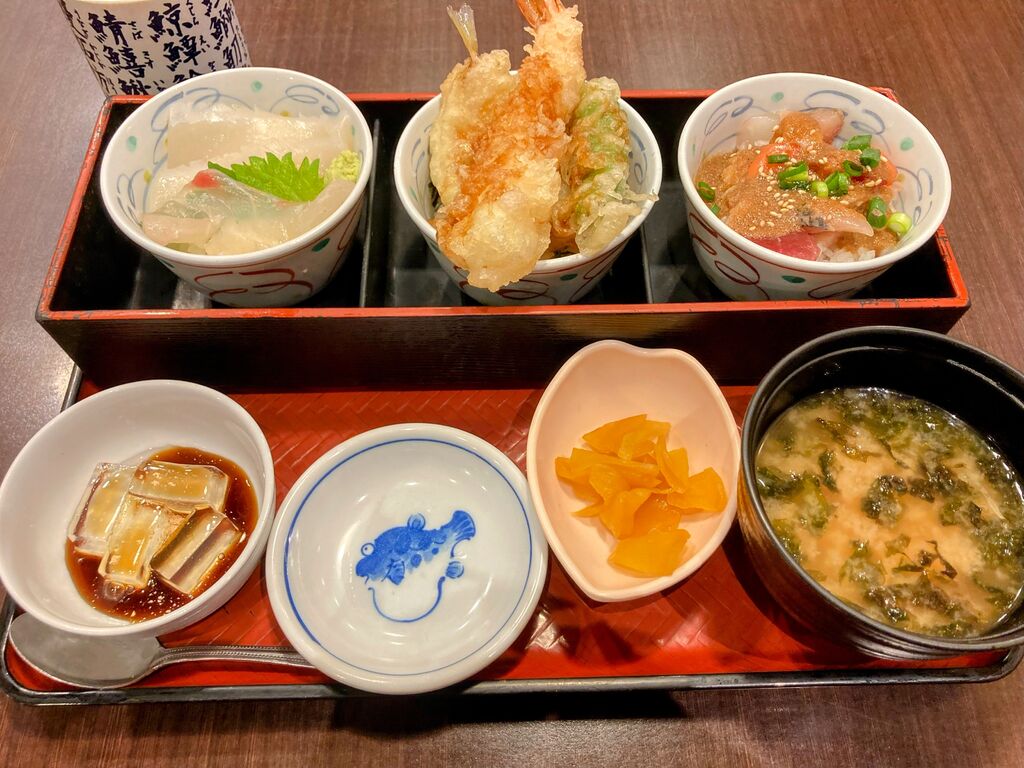 ランチで3つ選べる玉手箱を食べました。6種の丼から3種選べて本日の市場丼(イカとタイ)と天丼と海鮮ゴマだれにしました。ご飯も少なめ多め普通と選べます。お味噌汁の変更も可能です。普通だと少し少なく感じましたが美味しく頂きました。QRコード決済可能です。 (訪問:2025/02/19)