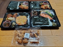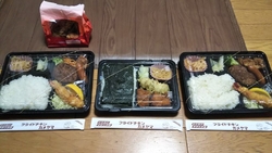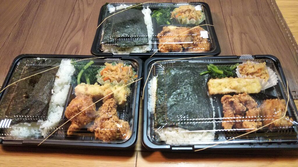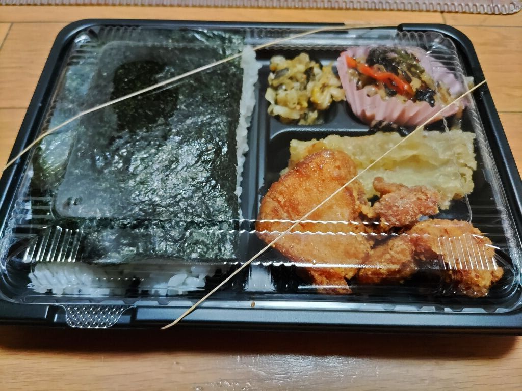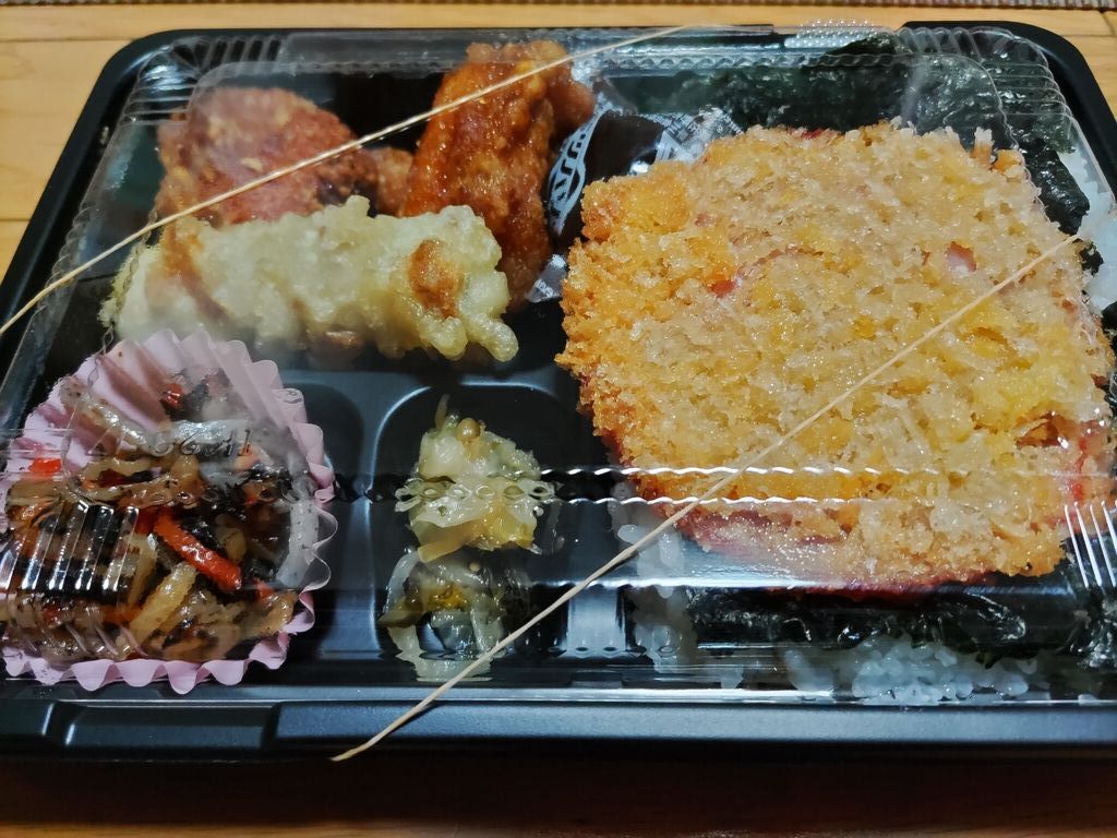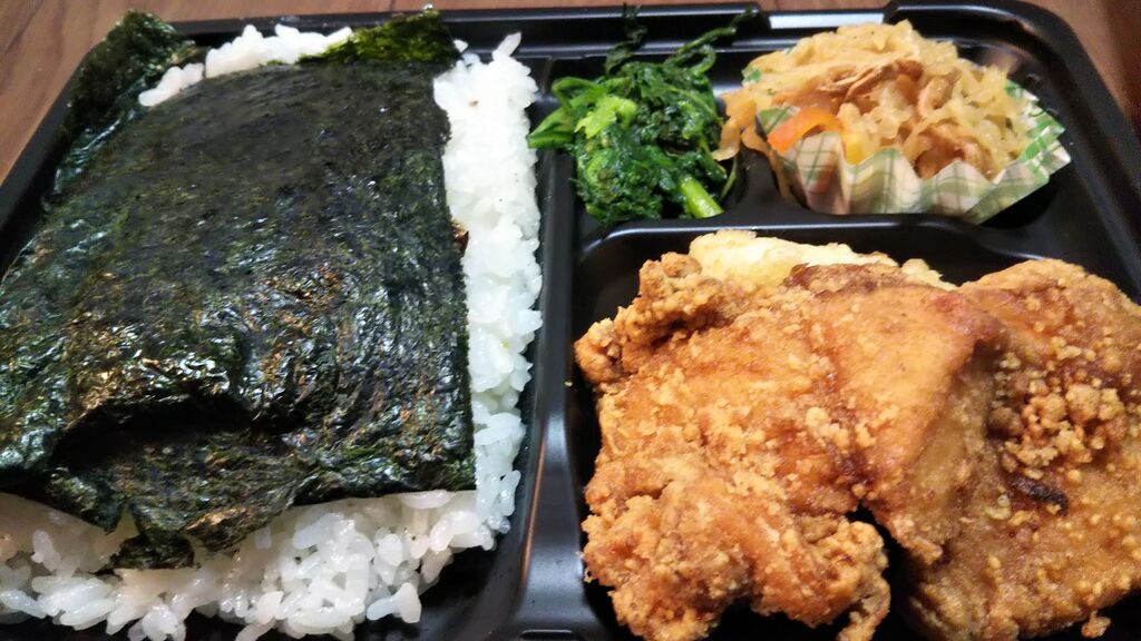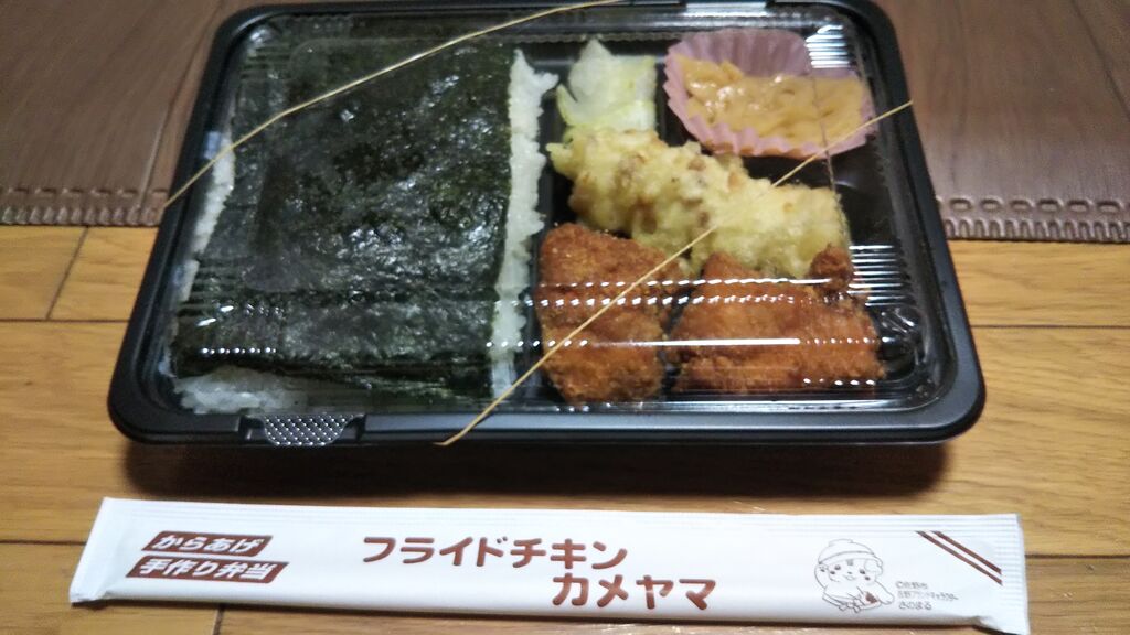 今日は、佐野市 フライドチキンカメヤマさんに、来ました。今日は、びっくりぽん(自分)も、2月の日曜日限定の日替わりメニューの、洋風幕の内弁当を購入しました。子供は、のりから揚げ弁当です。やはり、洋風幕の内弁当は、ボリュームありますね。エビフライ、から揚げ、ハンバーグ、ウインナー、スパゲッティー、ブロッコリー、レンコン、大根の漬物、ご飯ですね。から揚げは、カメヤマさんの、から揚げですね。いつ食べても、美味しいですね。ハンバーグは、和風ソースが、かけてありましたね。エビフライには、レモンをかけて、ミツハソースをかけて食べます。少しですが、千切りキャベツもあります。その他の付け合わせも、いいですね。子供は、なぜ、のりから揚げにするのかなと、思ったら、のりから揚げ弁当の、のりごはんが、美味しいからと言っていました。海苔に、かつお節、昆布にごはん、美味しいと言っていました。今回は、300円ぶん、から揚げも購入しました。そうしたら、5個、入っていました。ちなみに、洋風幕の内弁当は、500円、のりから揚げ弁当は、380円です。全て、税込みです。ごちそうさまでした。 (訪問:2022/02/20)