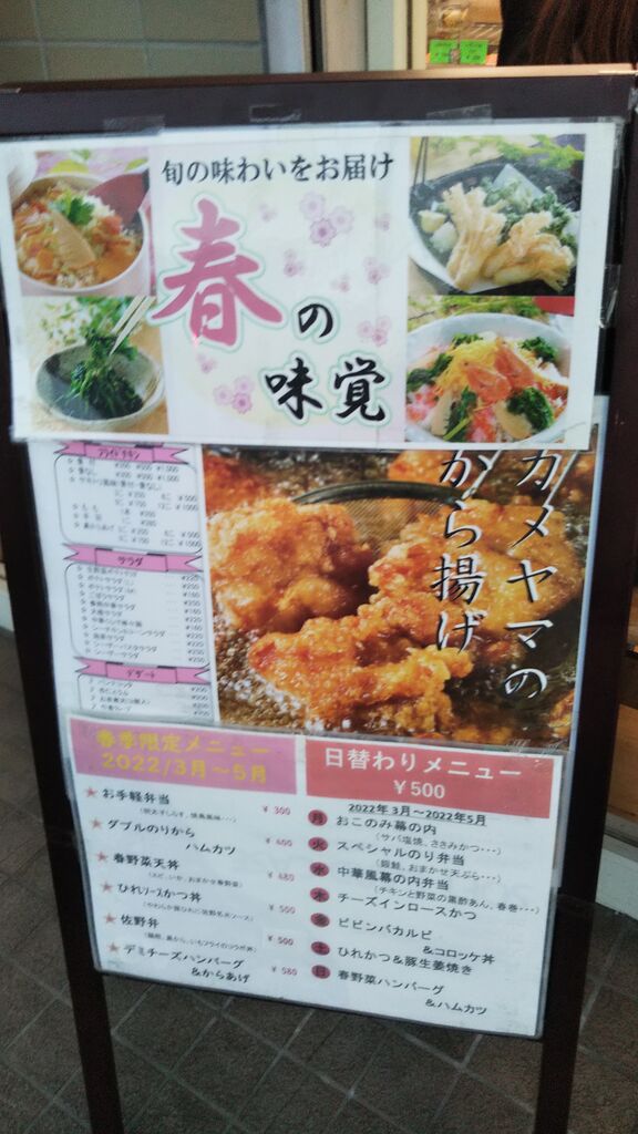 今日は、 佐野市 フライドチキン カメヤマさんに、来ました。今日も行列が、できていましたね。佐野市では、人気のある、お弁当屋さんです。カメヤマさんは、絶対に、から揚げが、オススメですね。サックとしたから揚げ、カメヤマさんオリジナル味付けのから揚げ、美味しいですよ。今日も、のりからあげ弁当を購入しました。美味しいご飯に、美味しいから揚げ、今日は、付け合わせが、切干大根と、春菊の、おひたしでした。でも、カメヤマさんは、いろいろな、お弁当の種類が、あります。サラダも、何種類もありますね。期間限定の商品もあります。でも、から揚げは、はずせないですね。 (訪問:2022/04/02)