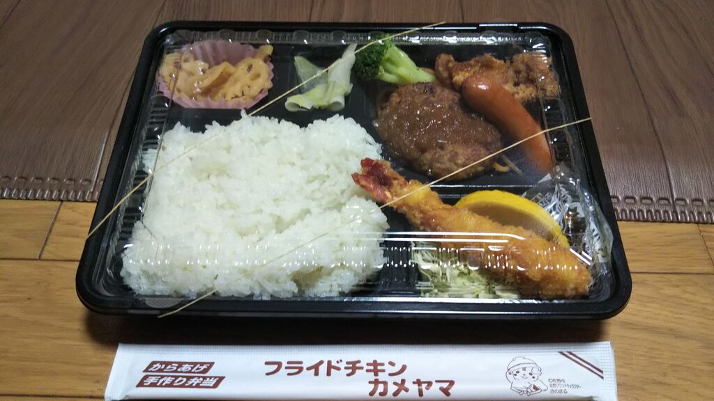 今日は、佐野市 フライドチキンカメヤマさんに、来ました。今回は、子供が、日替わりメニュー、洋風幕の内弁当を選びました。(日曜日限定商品です。) (期間限定商品です。2021年12月から、2022年2月まで、)、メニュー表には、洋風幕の内弁当には、(ミニバーグ、エビフライ、から揚げ)と書いてありました。カメヤマさんは、人気店なので、今回も、電話予約をしてから、行きました。びっくりぽん(自分)は、今回は、のりから揚げ弁当です。さっそく、子供の、洋風幕の内弁当を見たら、びっくり、いろいろな物が、入っていました。ボリュームありますね。お弁当の入れ物も、のりから揚げ弁当より、少しだけ大きめです。洋風幕の内弁当の中身は、もちろん、メニューに書いてあった、エビフライ、から揚げ、ミニバーグに、ウインナー、ブロッコリー、にんじん、スパゲッティー(ケチャップ味)に、千切りキャベツ、レモン、ミツハソース(佐野市では、早川食品さんの有名なソースです。)、漬物に、レンコンです。もちろん、カメヤマさんの美味しい、ご飯ですね。しかも、値段が、500円(税込み)です。洋風幕の内弁当は、日曜日限定商品で、期間も、今月のみに、なってしまいました。から揚げは、カメヤマさんの美味しい、から揚げですね。サクサクしていて、美味しいですよ。子供が、美味しいと言っていました。次も、これ、食べたいと、言っていました。びっくりぽん(自分)も、次回は、洋風幕の内弁当に、します。(チャンスは、あと、2回です。)、2022年3月からの、期間限定日替わりメニューにも、洋風幕の内弁当が、あれば良いですね。それか、定番メニューになれば、なおさら良いですね。もちろん、定番の、のりから揚げ弁当も、いつも通り、うまかった。ごちそうさまでした。(のりから揚げ弁当は、380円(税込み)です)。 (訪問:2022/02/13)