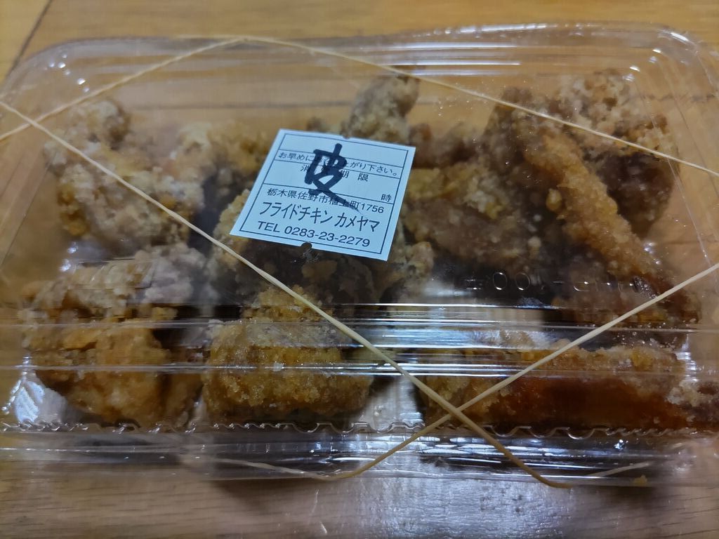 今日は、 佐野市 フライドチキンカメヤマさんに、久しぶりに来ました。佐野市では、有名なお弁当屋さんです。今日は、久しぶりなので、唐揚げを1000円分(税込み)と、海苔唐揚げ弁当 420円(税込み)を購入しました。唐揚げ1000円分は、ケーキ箱に入っていて、佐野市では、ちょっとした、手土産にも、喜ばれます。サックとした、うまい唐揚げです。お弁当のごはんは、栃木県産コシヒカリ100%とだそうです。だから、少し冷めても、美味しいはずだ。週末の夕方は、凄く混み合うので、電話予約が、おすすめです。びっくりぽん(自分)は、電話予約しないで、行ったら、1時間近く、待ったこともあります。(笑い)なので、早めの電話予約が、おすすめです。電話予約も週末の夕方に電話すると、混み具合で、1時間後ぐらいは、予約が、取れない事とあります。もし、佐野市に来たなら、佐野市のお土産としても、カメヤマさんに寄ってくださいね。おすすめです。メニュー表を写真添付したので、参考にして下さい。ごちそうでした。 (訪問:2025/09/05)
