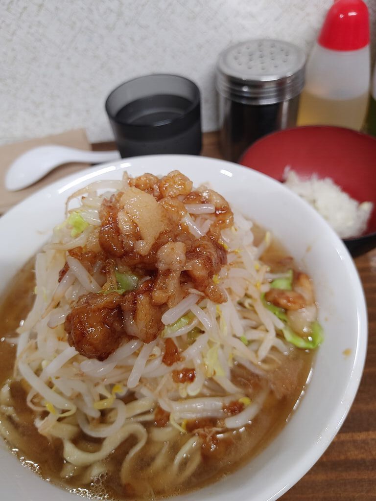 宇都宮で最も人気のある二郎系ラーメン店の一つです。 水曜の夜ご飯でお邪魔しました。 お店に入り、券売機で「ラーメン/800円」と「味付うずら/100円」の食券を購入。店内待ちがいま数人したが、すぐにカウンター席に案内されました。 無料トッピングは「全部」でお願いし、ほどなくして着丼。モヤシがコンモリ、アブラとニンニクがたっぷり盛り付けられた男前な一杯ですね♪ 豚骨スープは醤油ダレのパンチが効いていて「ガツン!」とくる味わいです。ワシワシと噛みごたえのある太麺と、極厚のチャーシューが絶品でしたヽ(^o^)丿 (訪問:2022/10/26)