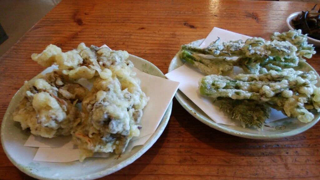 久しぶりにこちらのお蕎麦が食べたくなり、伺いました。駐車場脇に咲いていた桜は、濃いピンクと薄いピンクの花が混じっていて、あまりにもきれいだったのでつい写真を撮ってしまいました(^^♪。開店20分前に着いてしまったので、隣接している野菜直売所で竹の子(300円)を買いました。お店が始まり、早速メニューを見て、2人で5合そば(1,700円)、たらの芽天ぷら(300円)、舞茸天ぷら(300円)を注文!こちらのお店は、安くて美味しいので、佐野方面に行った時は、良く伺います。でも、ほかの人が話していたのですが、新型コロナの影響で4月12日(日)の営業をもって、暫くの間(確か5月8日まで?)休業になるみたいです。残念です。 (訪問:2020/04/11)
