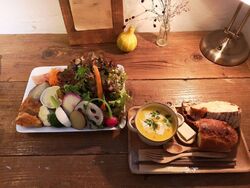 ずっと気になっていたので予約してランチに伺いました。【パンプレート/1,200円】は写真の通り素敵なメニューでした。焼きたてのパンとカボチャのスープ、プレートは新鮮な野菜のサラダとバーニャカウダにチキンも付いて盛りだくさんです。プチデザートはプチではないクレームブリュレが映画のアメリ気分です。カフェは火曜と金曜のみの営業ですが、ぜひまた予約して伺いたいです。 (訪問:2021/11/16)