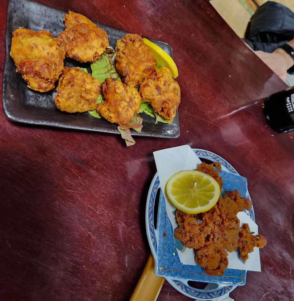 本日、打合せがあり帰りに蕎麦が食べたくて訪問。閉店1時間前なので軽く飲んで早々に蕎麦も注文しました。「鳥の唐揚げ 700円」「いいだこの唐揚げ 750円」「瓶ビール 650円×5」「ノンアルコール 400円×2」「大もり 650円×2」「鴨ざる 1,150円」「割子 1,450円」唐揚げをおつまみに最後に大好きな鴨ざるでお腹一杯です。 (訪問:2025/04/19)