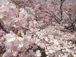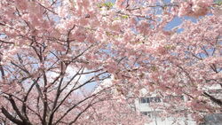 こちらの思川桜は開花が進みアーチが出来かけておりました。お散歩しながら眺める人を何人か見かけました。休憩するイス、テーブルが各所にあるので腰を落ち着けて花見をすることが出来ます。それ程長い並木ではないのでお手軽な場所と言えます。大学の建物と桜を見ながらユックリした足取りで観賞致しました。 (訪問:2021/04/01)