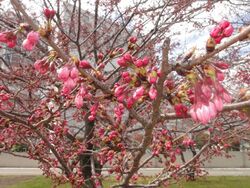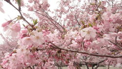 思川桜の開花が進み現在は4分咲き程度ですが鮮やかなピンクが冴え渡っておりました。十何人かの人が眺めていてソノ中にソメイヨシノと勘違いしている人もおりました。私が説明してあげようかと思ったら他の人が説明し本人は納得したようです。私も小山に住んでいて植栽されている場所が分かっているのでスグに思川桜だと分かりますが初めて見た人は何の桜だか分からないのも当然だと思いました。トニカク数多くの桜があるのでプレートなどに名前が書かれていないとドノ桜か言い当てるのは難しいです。 (訪問:2022/04/07)
