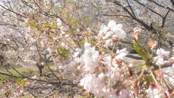 2014年4月14日(月)午前11時現在、栃木県小山市、白鴎大学東側、思川堤の思川桜は、ほぼ満開の状態です。樹木によっては、幾つか蕾も残っていますが、少し強い風が吹くと、花びらが1枚、2枚と散り始めました。日中は、春らしい暖かな陽気が続き、思川桜はそろそろ盛りの時季を越えようとしています。 (訪問:2014/04)