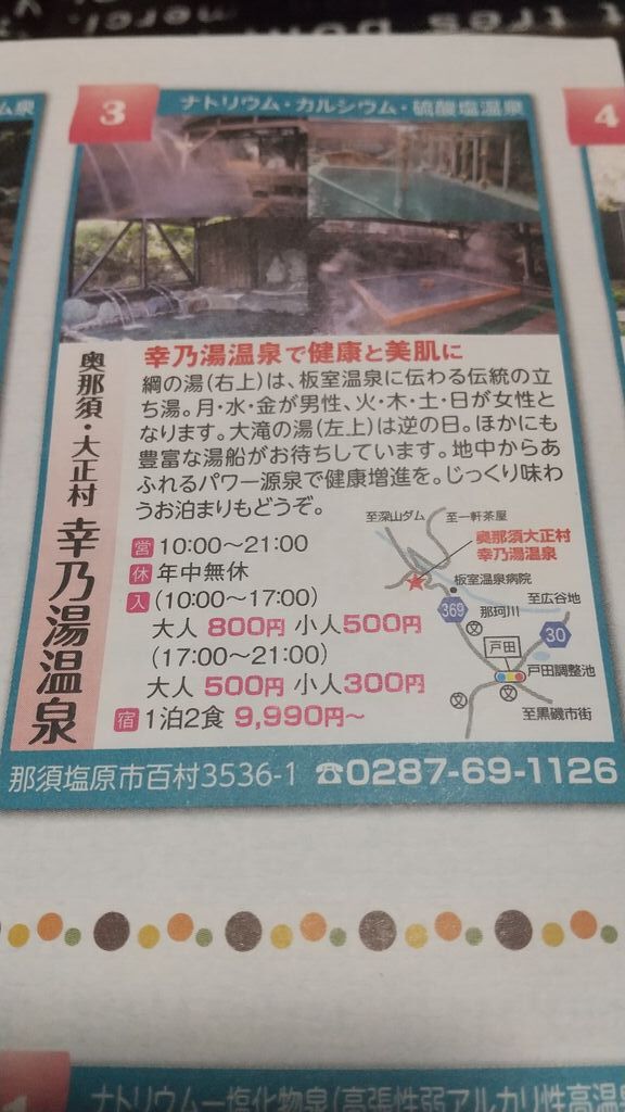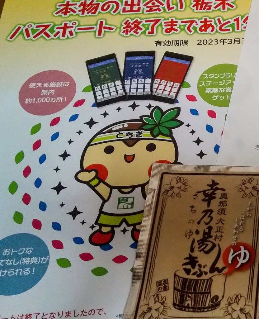 本物の出会い 栃木パスポート電子版 ☆各ステージクリアで送付していただいた「奥那須 大正村 幸の湯きぶん」温泉の素です。幸の湯さんは那須塩原方面(ダムを目指す途中)に通行する街道沿いに目にしていた温泉施設でいつか訪ねてみたいと思う場所でした。桜の開花が始まった県内ですがまだまだ寒い日の多い時期に嬉しいほっこりな記念品。新緑の頃に幸の湯さんを訪ねてみようと思います☆とちぎパスポート電子版は最終ステージクリア後も新に参加できるとあり再びお世話になっているところです。春のおすすめスポットが掲載されたパンフレットも魅力的な場所が盛沢山。有効期限は2023年3月31日となりますので是非沢山の方に活用してほしいと願っています☆ (訪問:2022/03/28)