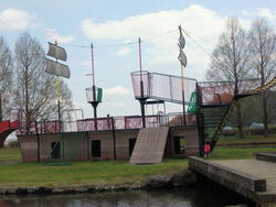 水の真ん中に設置された船の遊具はめったにお目にかかれない程の急降下な滑り台になっています。1回滑ってしまうとハマってしまう程楽しいですが、初めの1回目が勇気が必要です。 (訪問:2015/08)