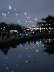 ゆうゆうパークでのイベント「夕焼けダイニング&スカイランタンナイト」に行ってきました。たくさんのスカイランタン、池にも映りこんでとてもキレイでした。 (訪問:2024/11/09)