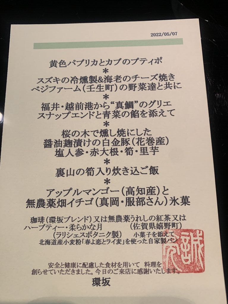 念願の環坂へ。完全予約制の懐石フレンチ。オーガニック野菜に素晴らしいお料理、楽しい時間を過ごすことが出来ました。ありがとうございます。人参が人参と言われるまで何か別の高級食材かと思ったり、デザートまで最高。こんなご時世ですが贅沢な時間でした。また来ます。 (訪問:2022/04/24)