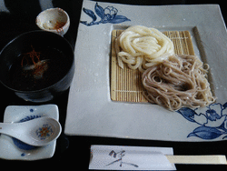 monmiyaを見て、トマトとチーズのうどんが食べたくなり、お邪魔しました。実際の注文は、メニューを見て食べたくなったカレーのつけ汁うどん!麺は白と黒の合盛りを選択しました。黒色の香ばしいカレーに、こしのつよい白麺と風味と喉ごしのよい黒麺がよく合います。久々に大ヒット!!ごちそうさまでした(^_^)v (訪問:2015/03)