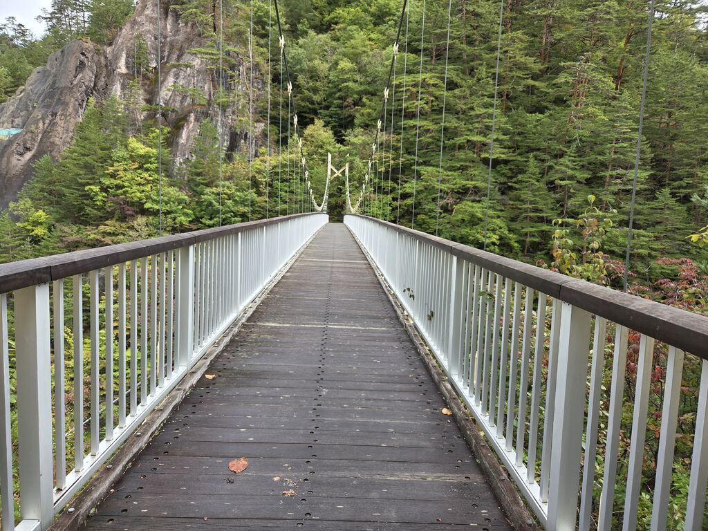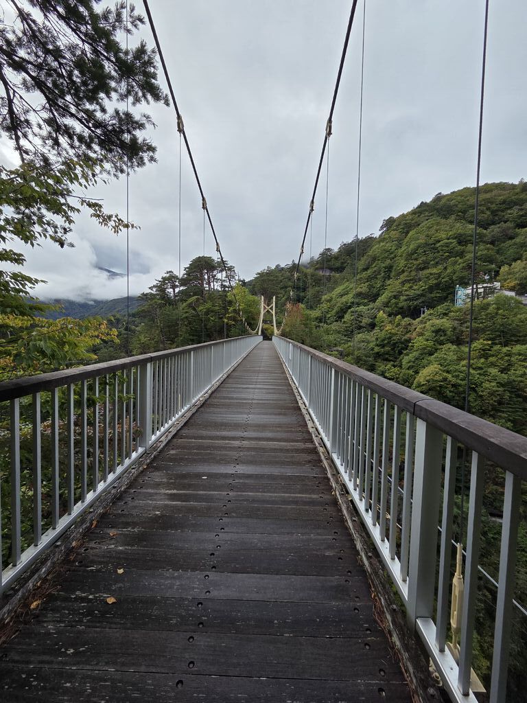 往復900段で歩行距離約2kmのコースです。道のりは急なアップダウンばかりで一番高い所には東屋が設けられ飲み物を飲みながら休憩されている方々がおられました。それより先の少し下がった所に天使の鐘があり鳴らすと周囲の山々に音色が響き渡りました。その下の標高950mの場所に長さ75mの名物である渡らっしゃい吊橋が架けられております。ここからはダムはモチロンのこと周囲の険しい岩肌の山々を彩る紅葉が堪能出来ました。約100m下の谷底に幅約17.5m、高さ15mのアーチ型の副ダムも見下ろせます。見終えて入口に戻り時計を見ると往復32分でした。半袖姿ですがコノ時期でも汗だくです。県内屈指の見晴しと足腰を鍛錬できる素晴らしい場所です。 (訪問:2023/10/21)