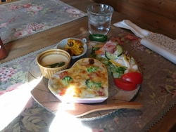 【ズッキーニのバジルパスタ】と【秋野菜ときのこのチーズ焼き】のランチセットを食べました♪セットのパンは【ピザトースト】と【キーマカレー】、デザートは【パンナコッタ】と【フルーツあんみつ】です♪ワンプレートにメインと野菜サラダ、かぼちゃのサラダ、キッシュがキレイに並びます(о´∀`о) 野菜たっぷりで大満足!デザートも無花果や柿がいて健康的!ログハウスの店内はとても落ち着きました♪お店のマダムもとても親切で居心地が良くお食事も美味しくまた来ますね♪ごちそうさまでした☆ (訪問:2022/10/29)