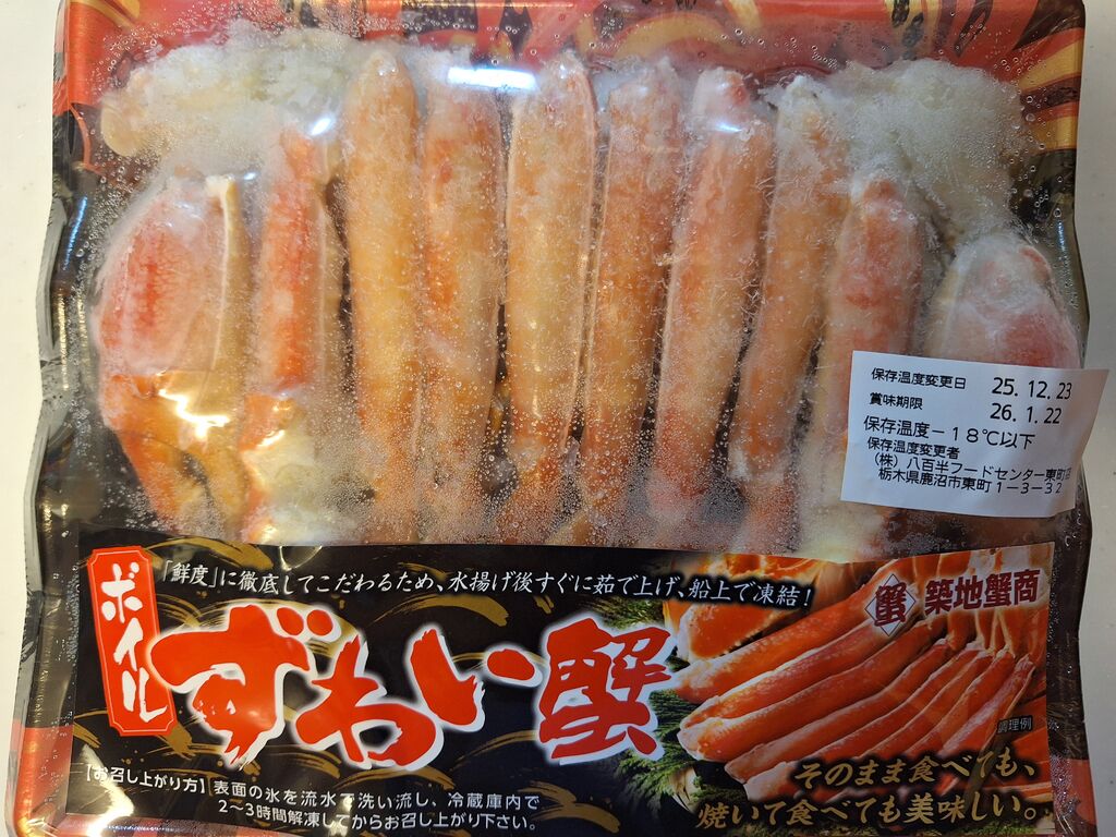 令和7年度第2弾鹿沼市キャッシュレスキャンペーン最終日なのを思い出し、買い出しへ出掛け、d払いで、早めにお正月用品を購入しました☆魚売り場の方が、ちょうど蟹を並べていて、思わず「大きい!」とビックリしてしまいました。特大2キロのタラバガニでした!予算オーバー&食べきれないと我が家は購入できませんでしたが、ズワイガニ1980円を購入しました♪CGCの便利なチャック付き冷凍野菜や、がっつりメガ盛りでお買い得なジャンボパックの厚切りハムカツを購入しました(^ー^) (訪問:2025/12/26)