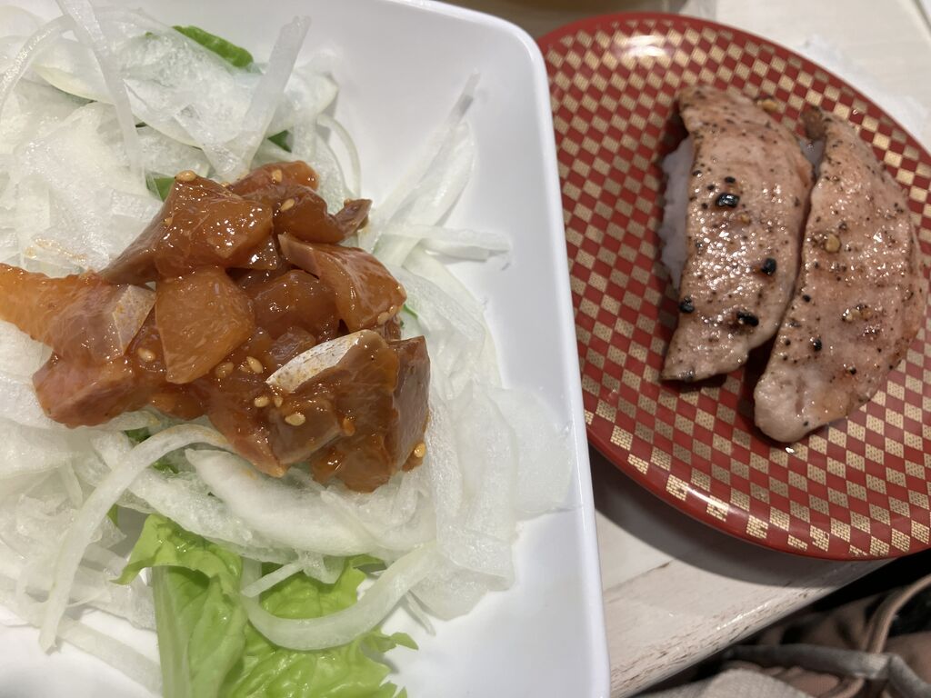 お寿司を食べに行きました。ガリは無料で注文式となっています。小皿に盛り付けてレーンで運んできてくれるので衛生的で安心できます。チーズがかかったポテトは量が多いので、シェアして食べました。 (訪問:2025/08/02)