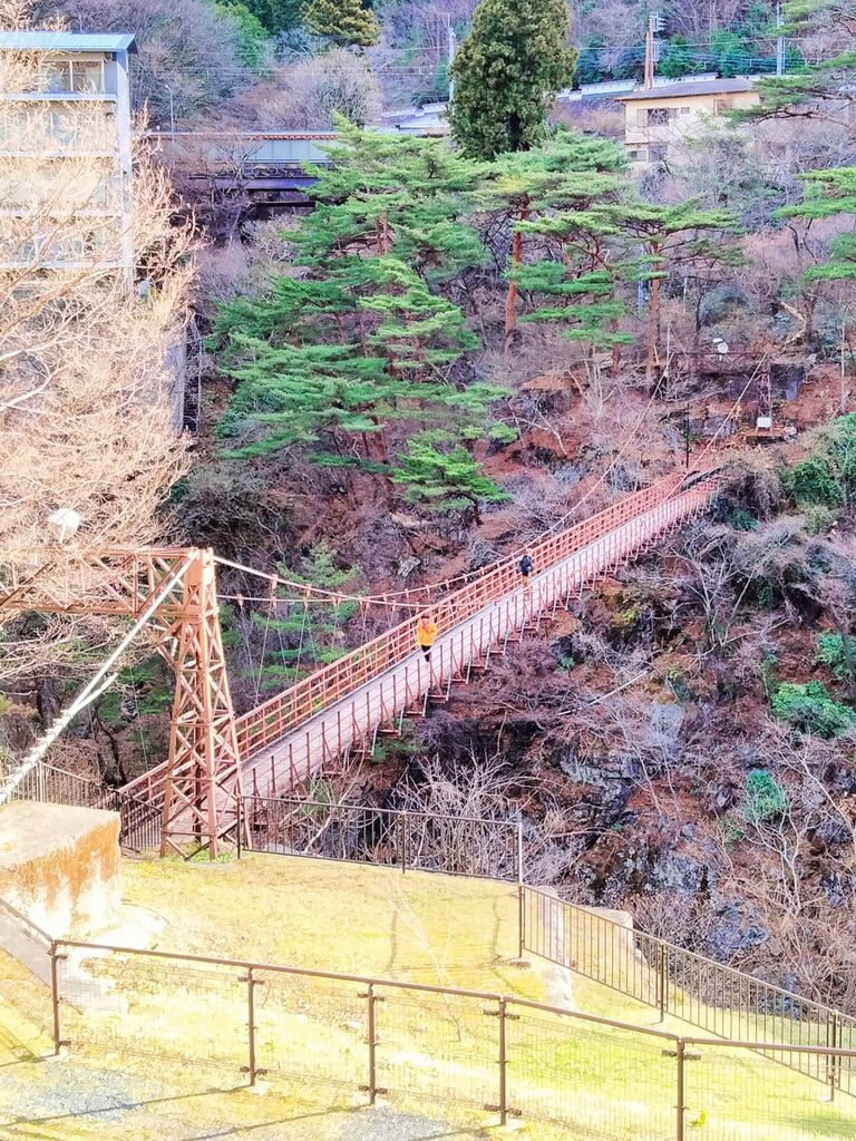 | ◇滝見橋 公園至近。鬼怒川温泉街の橋で唯一の吊り橋。スリルと景観が楽しめます。 |