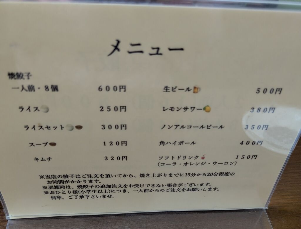 初めての訪問です。大きい餃子で食べ応え抜群でした。焼き時間がかかるので時間に余裕を持って行くことをお勧めします。とても美味しくってまた行きたいと思います!ご馳走様でした。 (訪問:2025/04/19)