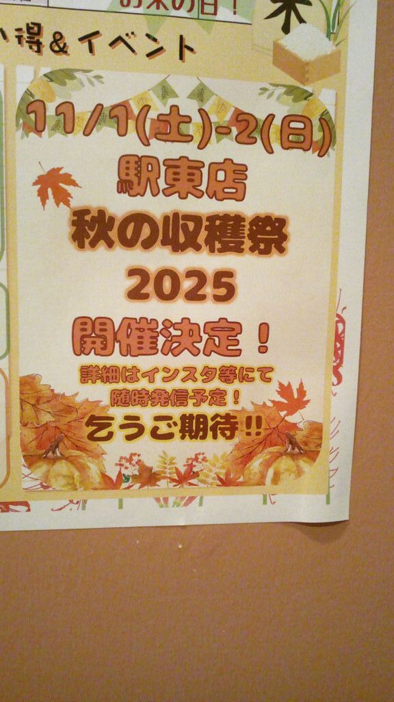 秋の収穫祭が、来月1日(土)と2日(日)に開催されるそうです。店内に掲載されていたポスターを添付します。どんな内容か楽しみです‼ (訪問:2025/10/19)