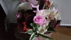 こちらのアレンジされたお花をいただきました(*^^*) ピンク系の色を基調としています!大好きなスイートピーもあります!幸せをありがとうございました(*´▽`*) (訪問:2022/04/16)